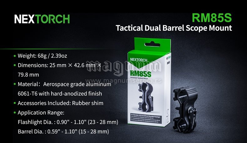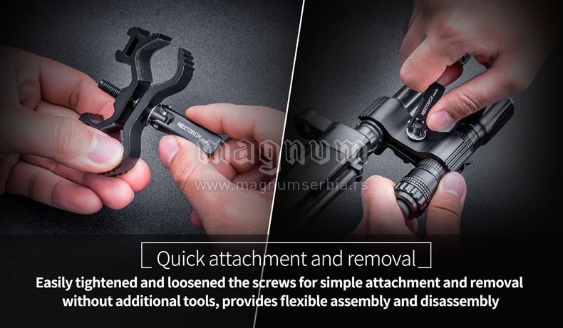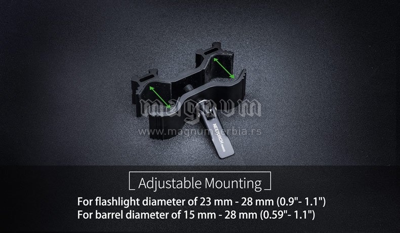Držač za lampu, jednostavan za upotrebu i instaliranje bez upotrebe alata. Podesivog prečnika, tako da odgovara širokom rasponu baterija za prečnik cevi od 25,5-30 mm. i prečnik lampe od 20 - 28mm. Izradjen od izdržljive legure aluminijuma.