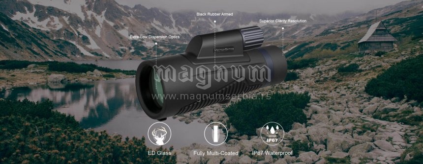 Monokular Forester 10x50 , 6 grupa, 8 sočiva, prizma sa srebrnim slojem, višeslojno ED sočivo. Premaz za korekciju faze i dielektrični premaz, gumeni poklopac.