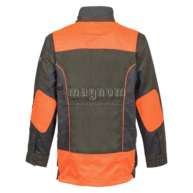 Ova praktična i funkcionalna lovačka jakna izrađena je od kvalitetne mešavine materijala — 65% poliester i 35% pamuk, sa vodoodbojnim tretmanom koji pruža dodatnu zaštitu od vlage. Posebni narandžasti paneli od 100% poliestera su vodootporni i izdržljivi, osiguravajući bolju vidljivost i dugotrajnost.