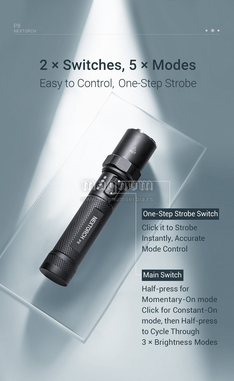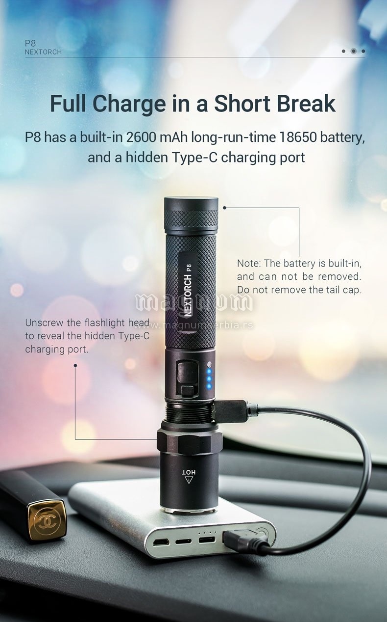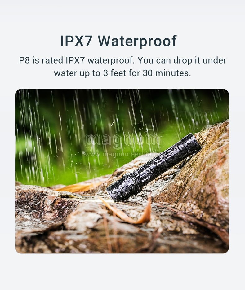 Baterijska lampa P8, kompaktna, moćna, ekonomična baterijska lampa, visokih perfomansi, sa maksimalnom izlaznom snagom od 1300-1600 lumena. Pet režima da zadovolji različite potrebe za osvetljenjem.
