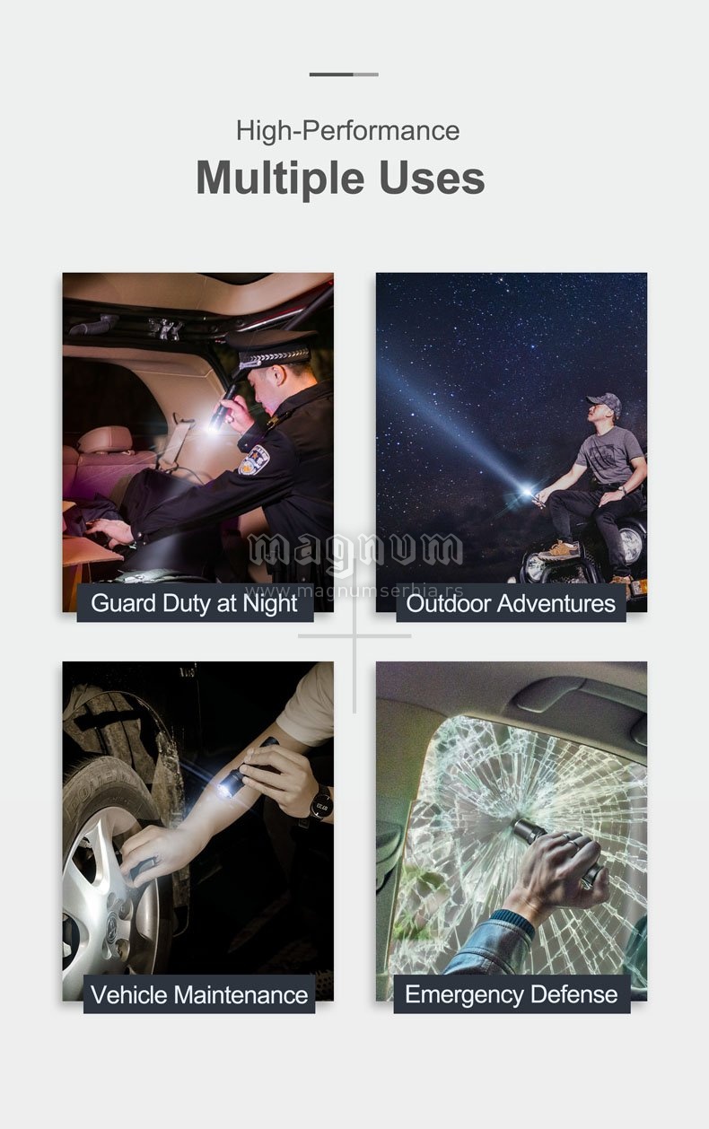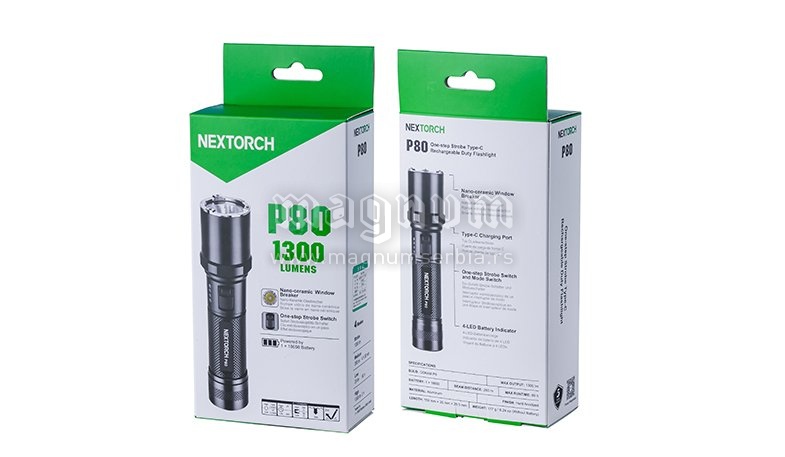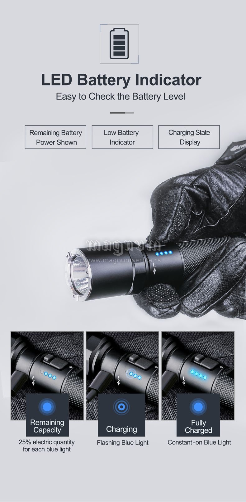 Baterijska lampa P80, sa maksimalnom jačinom od 1300 lumena. belo svetlo. Ugradjen USB punjač.