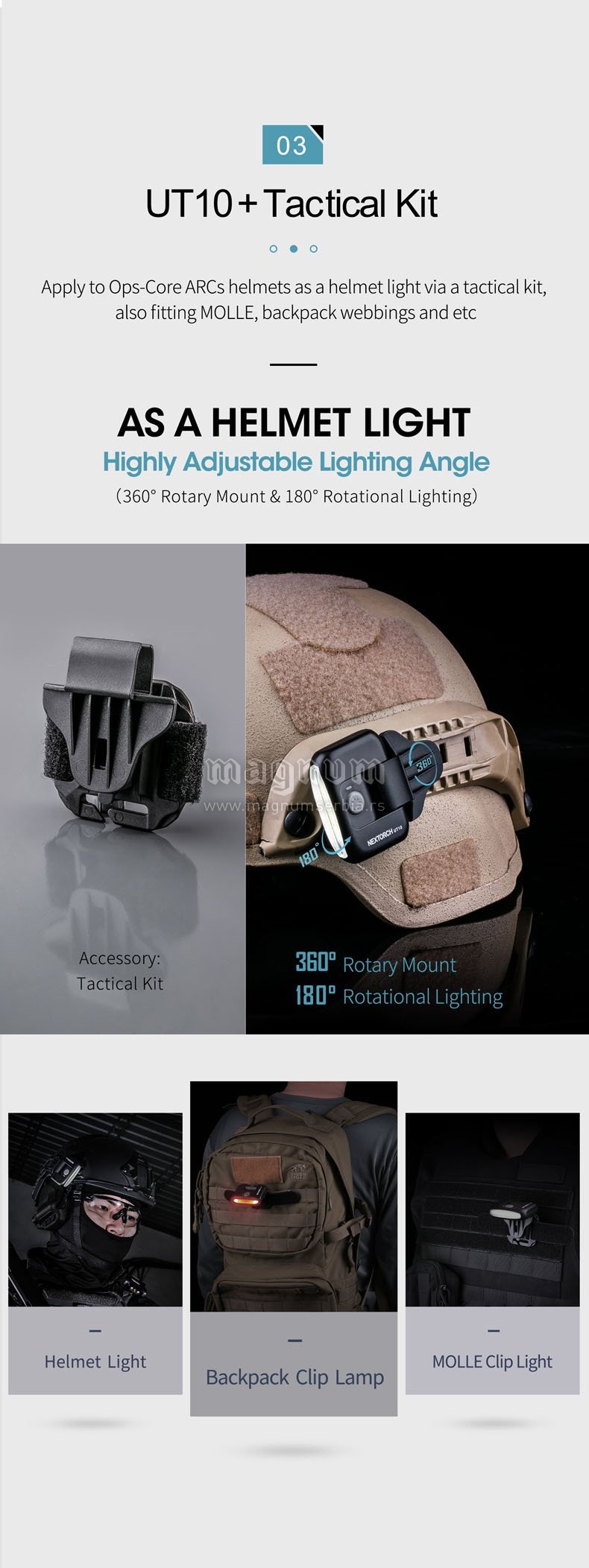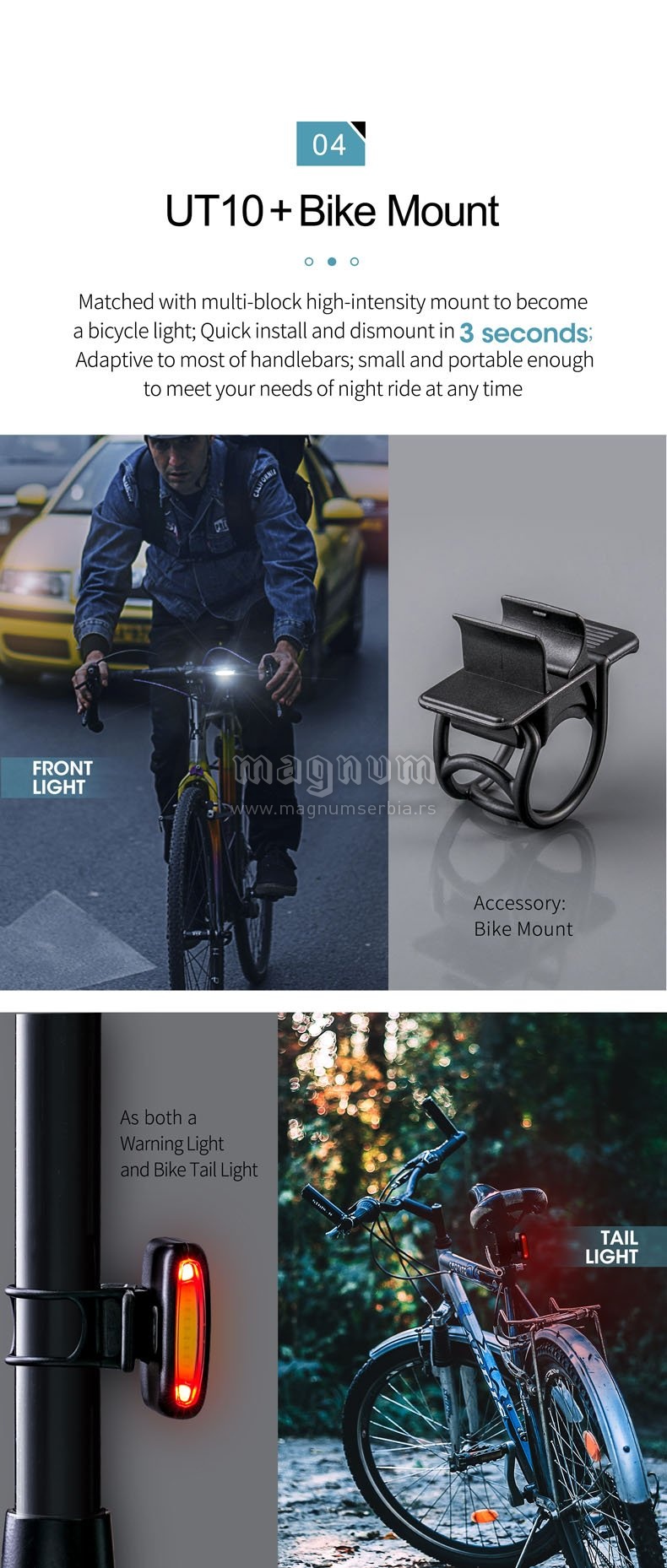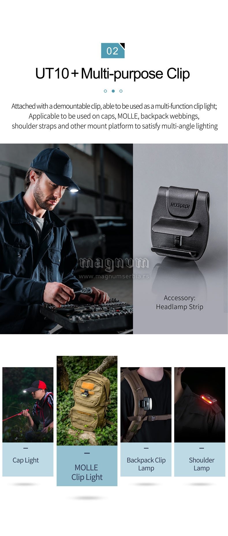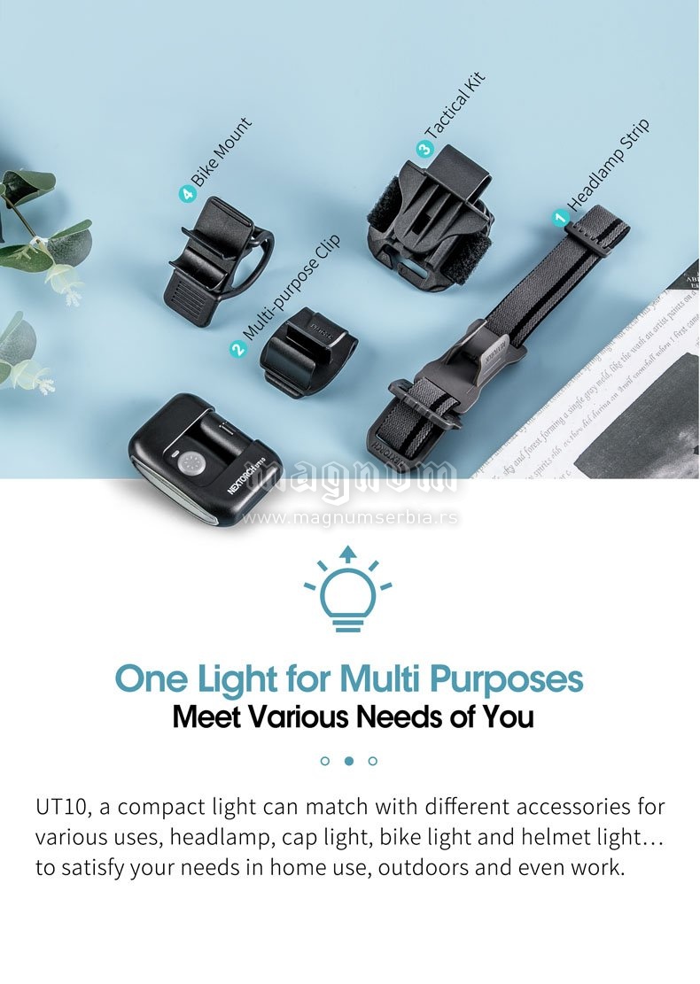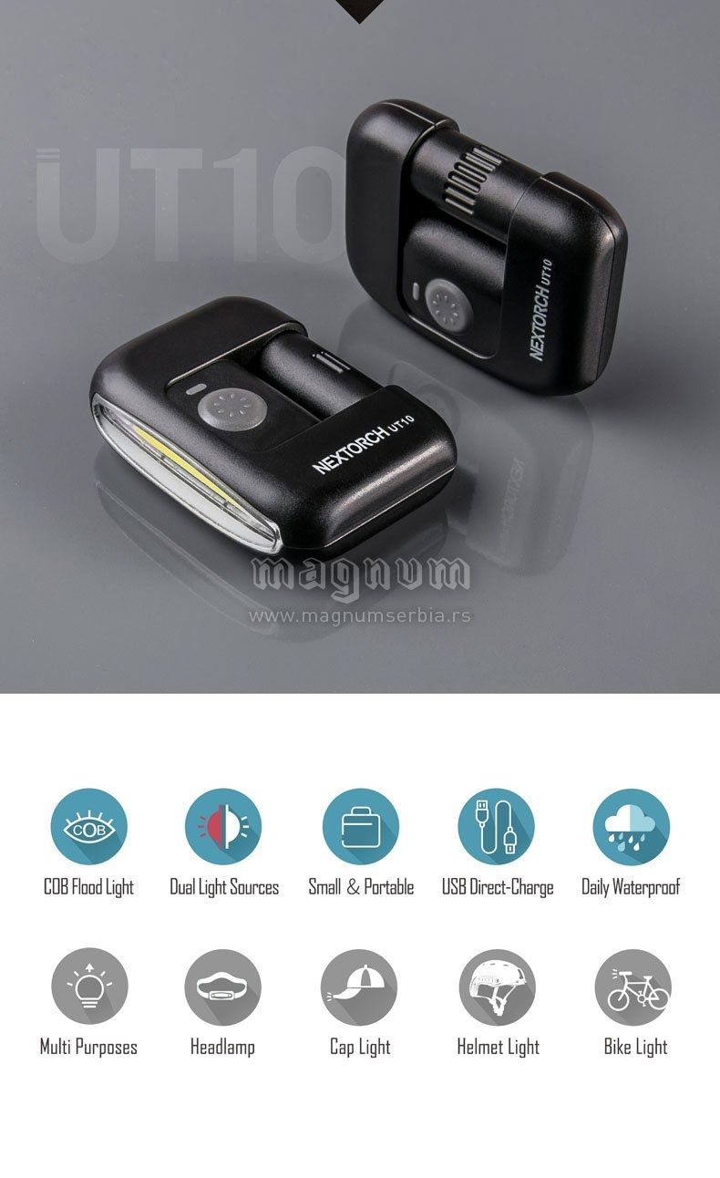 Multifunkcionalna, inovativna LED lampa, usb kabal za punjenje, daje udobnu, mekanu i ne bledu svetlost. Jedno dugme za realizaciju 4 režima osvetljenja koja se lako kontrolišu: bela jača svetlost/170 lumena; bela slabija svetlost/20 lumena; crveno svetlo/ 5 lumena/ crveni blic. U kombinaciji sa višestrukim priborom u kompletu, lampa može da se koristi kao prednje svetlo, svetlo na poklopcu, svetlo na biciklu, svetlo na kačketu.. Sa laganim dizajnom i male veličine pogodna je za nošenje i laka za upotrebu.