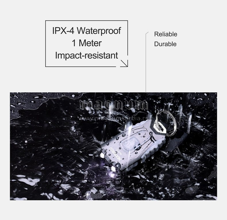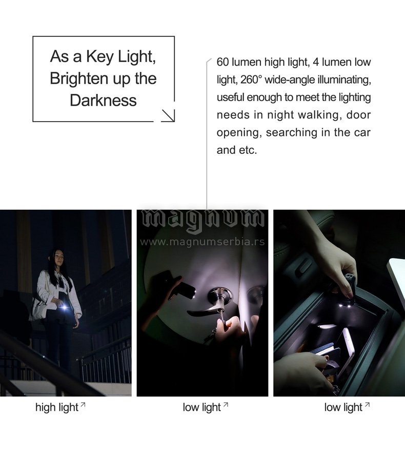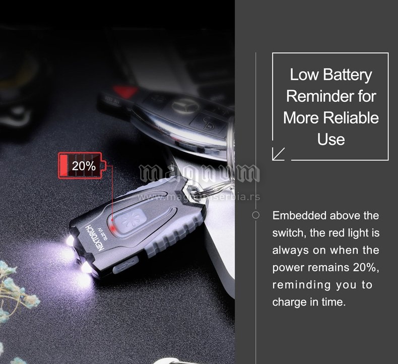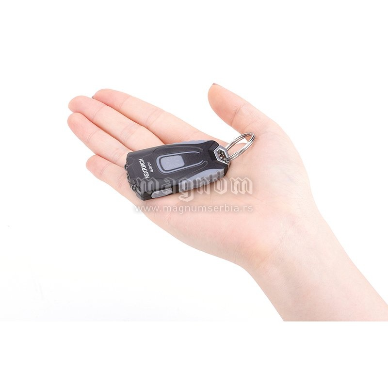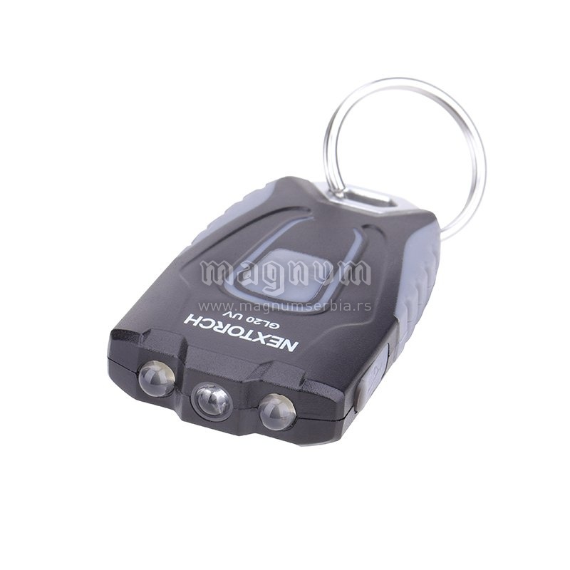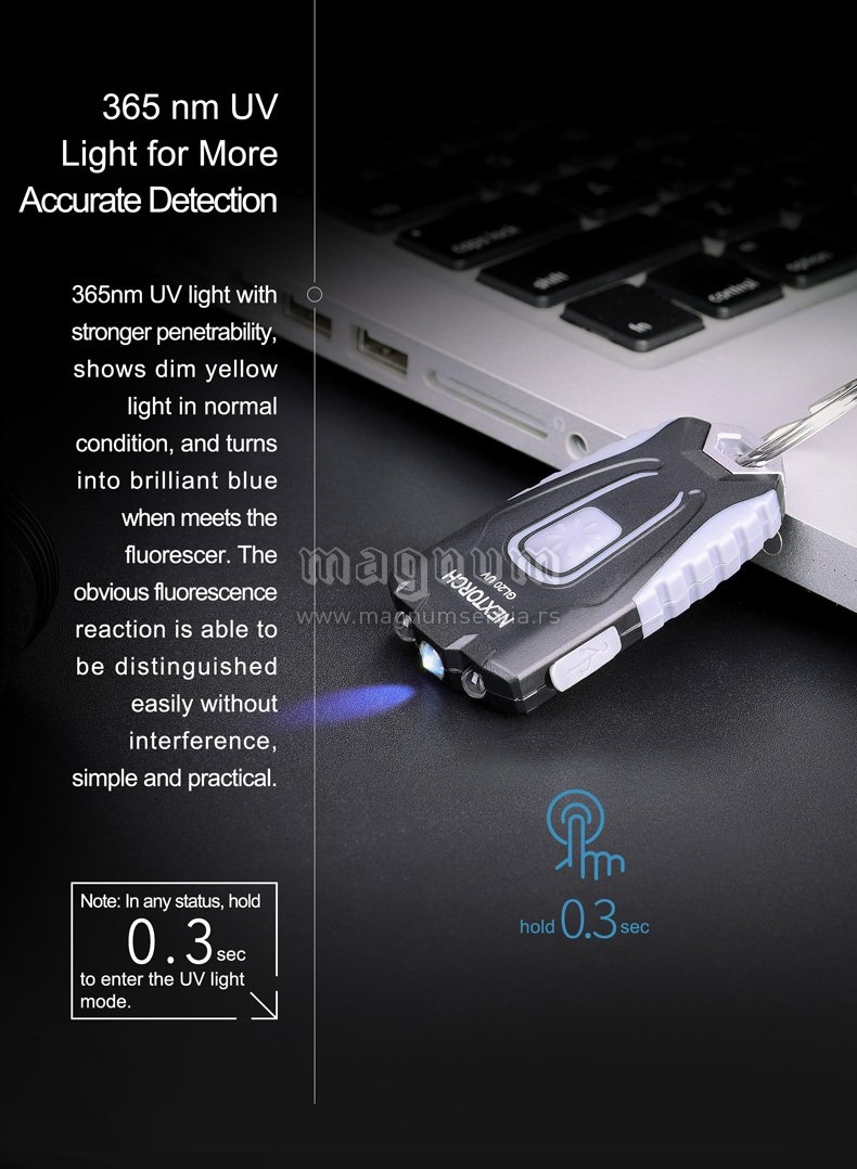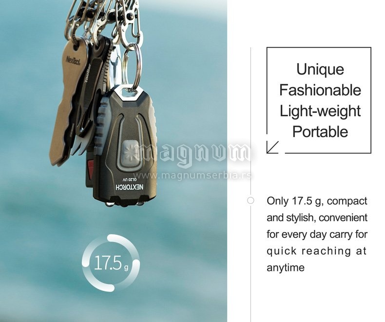 NexTORCH novi brend-privezak sa alkicom od nerdjajućeg čelika, ne veći od štapa žvake, za svakodnevnu upotrebu. Višenamensko svetlo sa belim i UV svetlom u jednom. Pokreće je punjiva litijum polimer baterija, ekonomična. Moderan izgled, lagan dizajn.