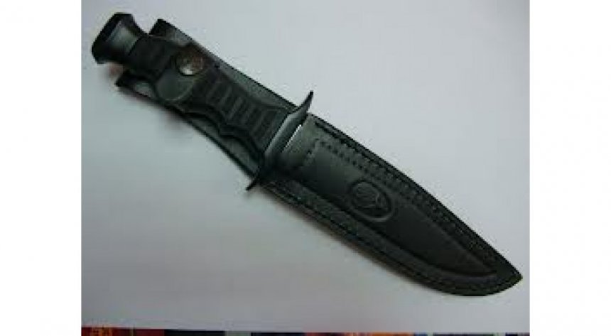 Muela 85-141 lovački delimično nazubljen nož od nerđajućeg visokokvalitetnog čelika 440C tvrdoće po Brinelu HB 54-58 RC sa crnom drškom od elastomera i crnim štitnikom. Isporučuje se sa kožnom futrolom