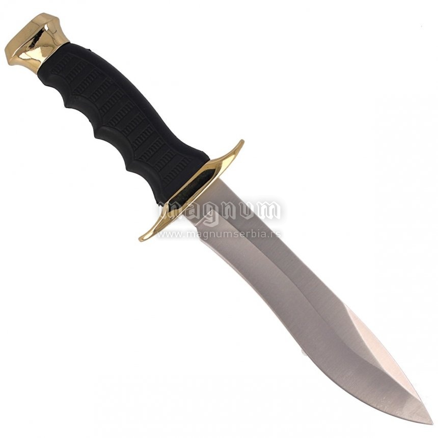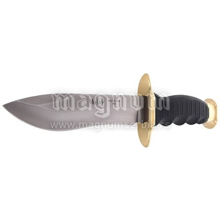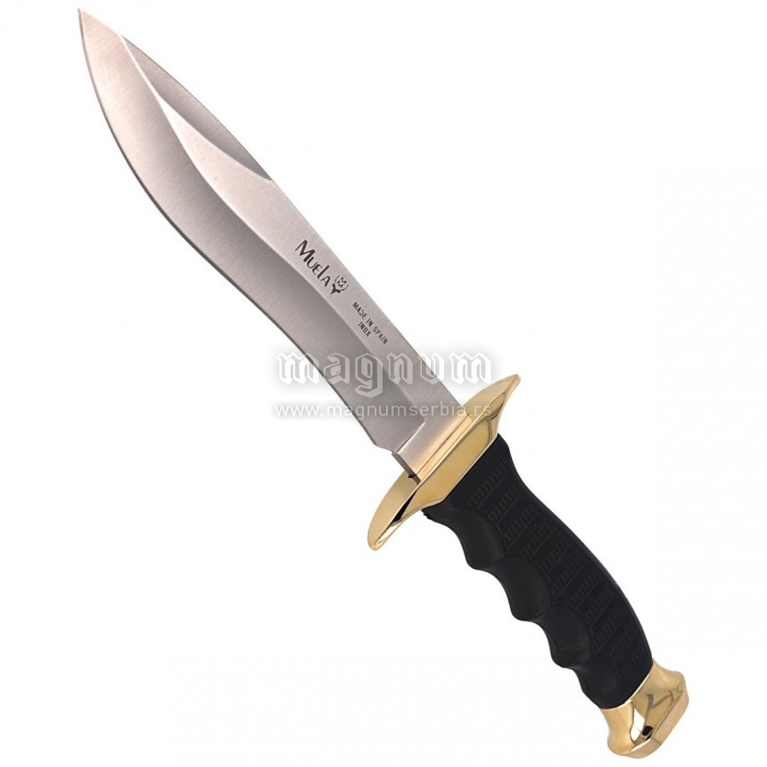 Muela 85-160 lovački delimično nazubljen nož od nerđajućeg visokokvalitetnog čelika 440C tvrdoće po Brinelu HB 54-58 RC, sa crnom drškom od elastomera i pozlaćenim štitnikom.