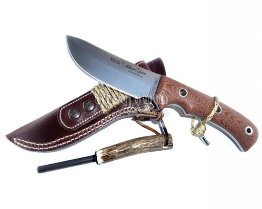 Isporučuje se sa braon kožnom futrolom i kremenom od magnezijuma uklopljen sa finom ručkom od roga jelena.