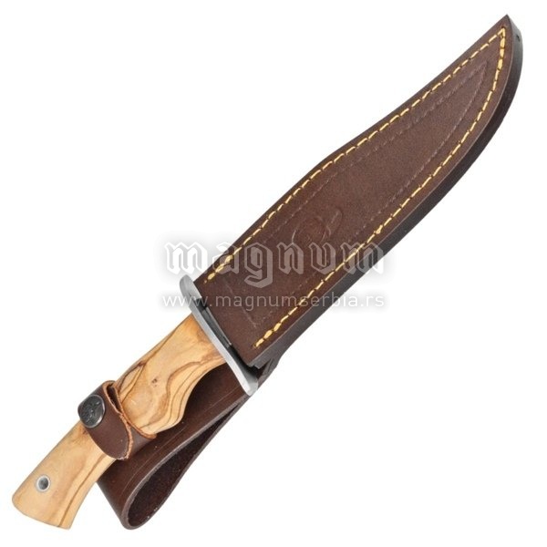 Drška od maslinovog drveta nudi udoban i siguran hvat, dok korice od prirodne goveđe kože sa reljefnim logotipom omogućavaju lako nošenje.