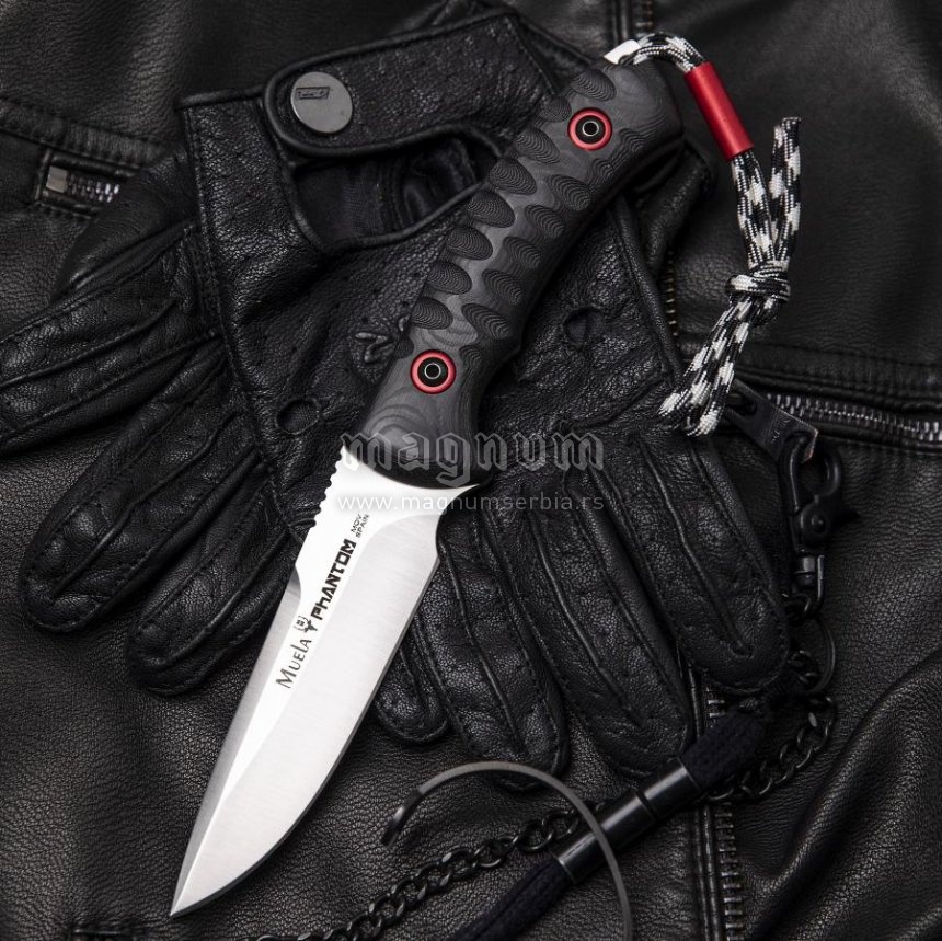 Pre svega poznata po visokokvalitetnim lovačkim noževima, Muela se upušta u taktičke oblasti sa Phantomom 12W. Nož sa masivnim sečivomX50CrMoV15 i ukrasnim rikasom na zadnjoj strani sečiva je opremljen teksturiranim skalama za dršku od crne mikarte za maksimalno prianjanje. Dekorativne akcente dodaju crveni odstojnici i prstenovi oko vijaka ručke. Dolazi sa trakom i crnim kožnim koricama.