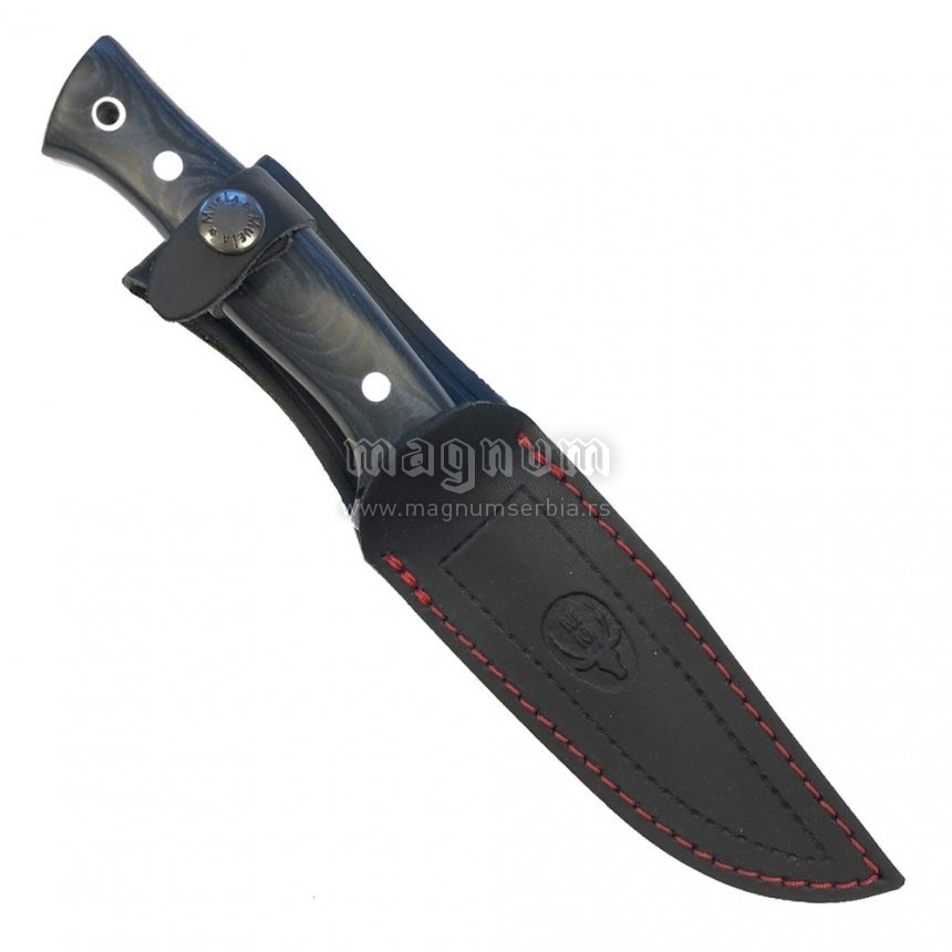 Muela Pointer je kompaktan lovački nož tankog dizajna.Drške napravljena je od crne / plave Micarte, dok se oštrica sastoji od x50CrMoV15 otporne na koroziju. Kratka zaštita za ruke osigurava sigurno rukovanje. Kožni omotač i rupa za vez upotpunjuju model.