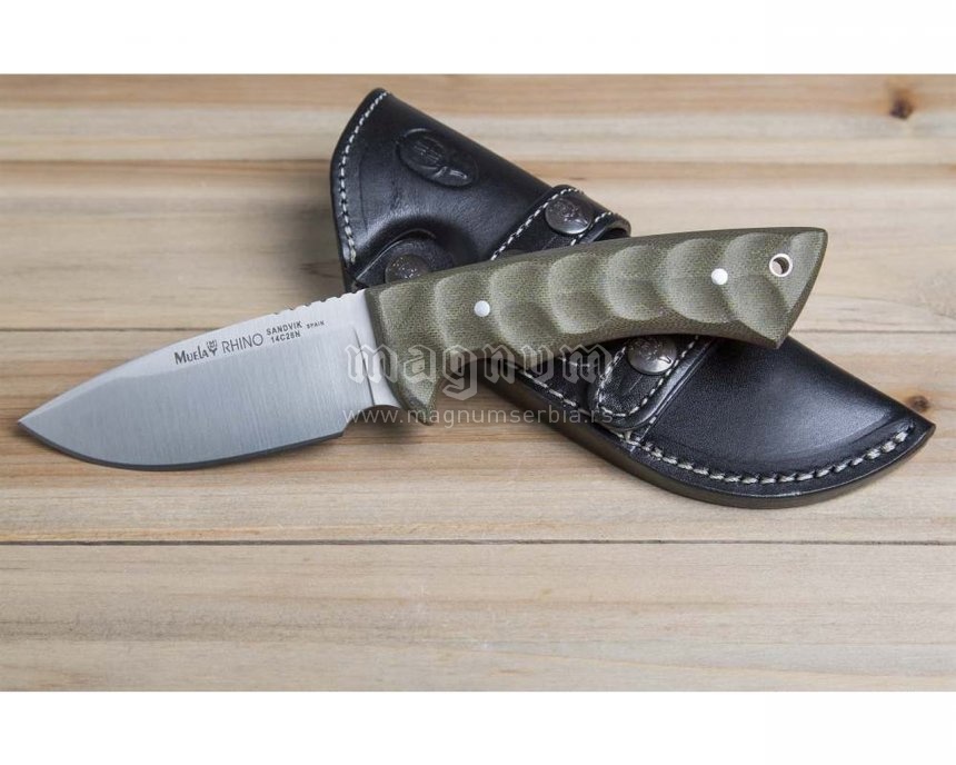 Mikartu od zelenog platna teško je nadmašiti u smislu njegove pogodnosti kao materijala za dršku za noževe na otvorenom. Stoga je razumno da Muela sada nudi popularnog Rhino noža dostupnog u ovoj verziji u kombinaciji sa posebno visokim performansama 14C28N čelika Sandvik oštrice. Izbrušena površina podržava grip i daje Rhino mircata green posebnu vizuelnu privlačnost koju dodatno poboljšava podloga od crvenih vlakana. Crna kožna futrola za horizontalnu ili vertikalnu konfiguraciju nošenja.