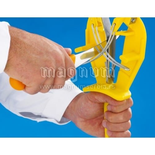 Ergonomska ručka i stabilna konstrukcija obezbeđuju sigurno i udobno korišćenje, dok optimalan ugao oštrenja garantuje konstantno precizan rezultat. Dovoljno je nekoliko poteza da i istrošen nož ponovo postane izuzetno oštar i spreman za precizno sečenje mesa, povrća ili drugih namirnica.