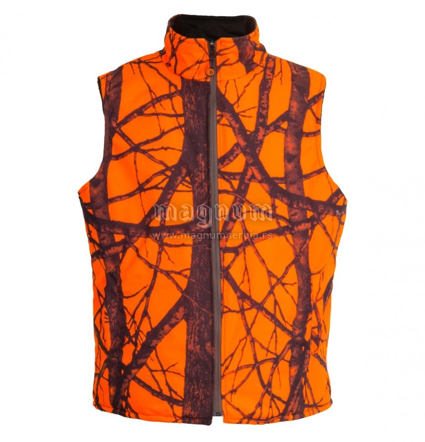 Prsluk termo sa dva lica, poseduje dva veća našivena džepa i dva kosa lajsna džepa na fluorescentnoj strani.