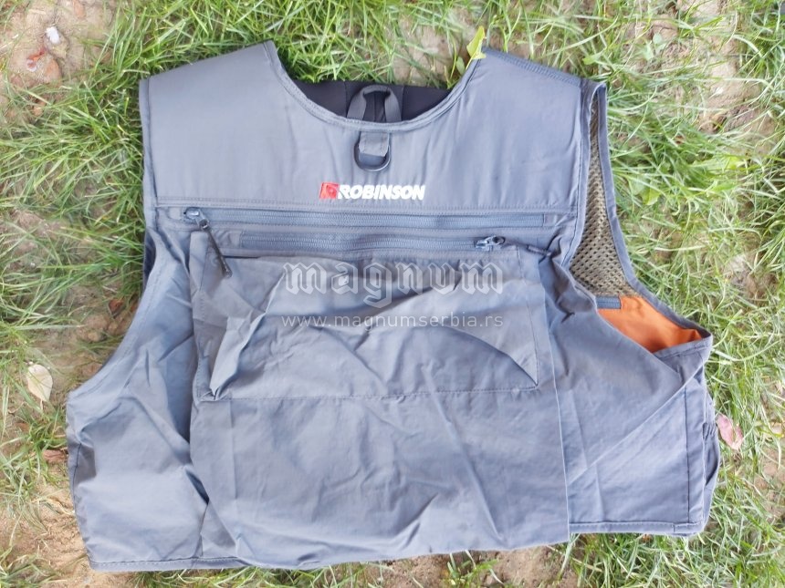 Prsluk za univerzalnu upotrebu. Opremljen sa 12 prednjih džepova i 2 prostrana džepa na leđima i sa 4 unutarnja džepa pričvršćenih patentnim zatvaračem. Brend: Robinson