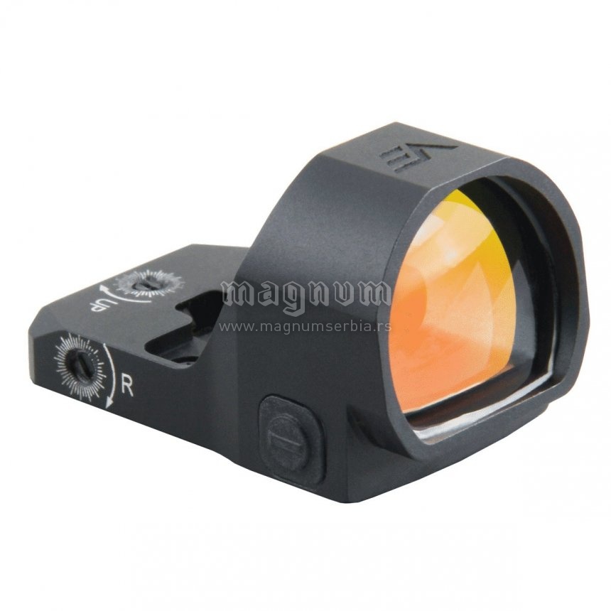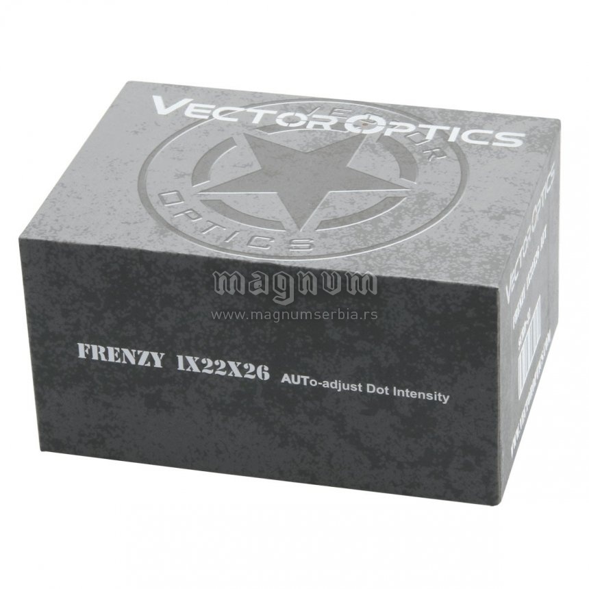Red dot Vector Optics Frenzy 1x22x26 SCRD-37, super tanak profil od samo 7mm, izuzetno veliki prozor veličine 22x26mm. Možete da vidite više! Aluminijumsko kućište 6061-T6 odličan izbor za svakog lovca, rekreativnog strelca, pruža jasnu oštrinu koja je od vitalnog značaja za postizanje uspeha u lovu. Kompaktnog dizajna, lagane težine, kompaktnog stila. Prekidači za uključivanje/ isključivanje na bočnoj strani, potpuna korisnička kontrola i automatski senzor svetla. Pikantini šina