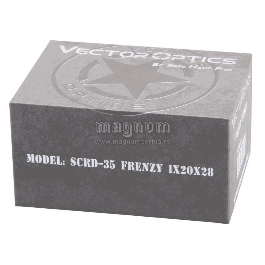 Red dot Vector Optics Frenzy 1x20x28 SCRD-35, super tanak profil od samo 7mm, izuzetno veliki prozor veličine 20x28mm. Možete da vidite više! Aluminijumsko kućište 6061-T6 odličan izbor za svakog lovca, rekreativnog strelca, pruža jasnu oštrinu koja je od vitalnog značaja za postizanje uspeha u lovu. Kompaktnog dizajna, lagane težine, kompaktnog stila. Prekidači za uključivanje/ isključivanje na bočnoj strani, potpuna korisnička kontrola i automatski senzor svetla. Pikantini šina
