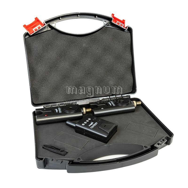 Odličan signalizator, električni alarm, velika pomoć ribolovcima. Dolaze u kompletu sa plastičnom kutijom, savršenom za skladištenje i transport. Radio prijemnik je u stanju da signalizira do 150m. udaljenosti, tako da ribolovac koji se nalazi van opreme, može biti informisan o ulovu ribe.
