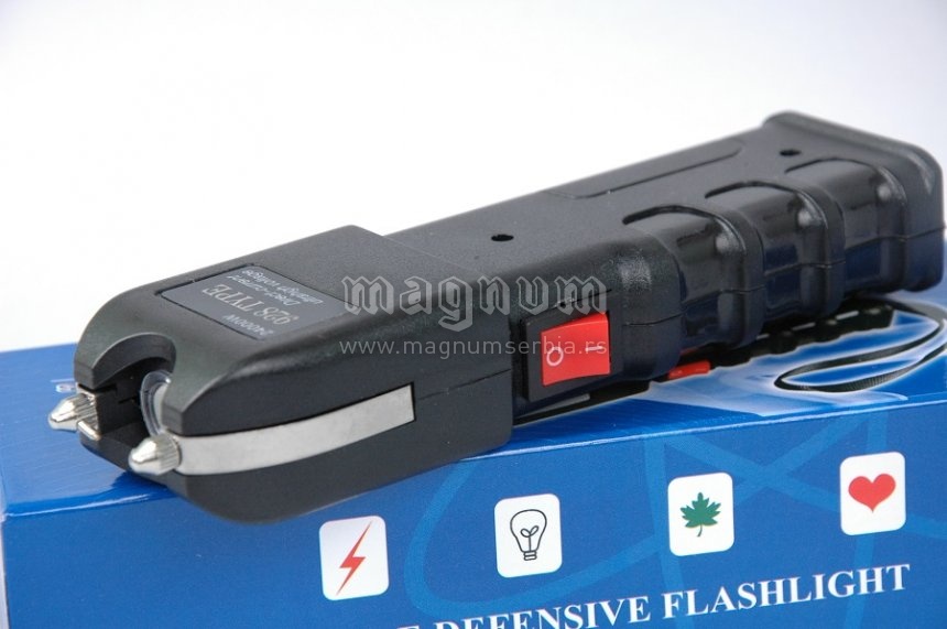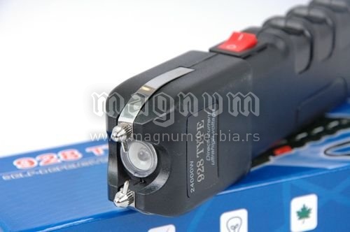 Elektrošoker Tejzer veoma velike snage, trenutno najjači model šokera kod nas na tržištu. Uređaj ima sa prednje strane baterijsku lampu. Takođe sa prednje strade ima napredan sistem protiv otimanja uređaja. Uređaj je namenjen isključivo za samoodbranu. Vrlo efikasan elektrošoker. U kompletu se nalazi zaštitna futrola i punjač za 220V. Čuvati van domašaja dece.