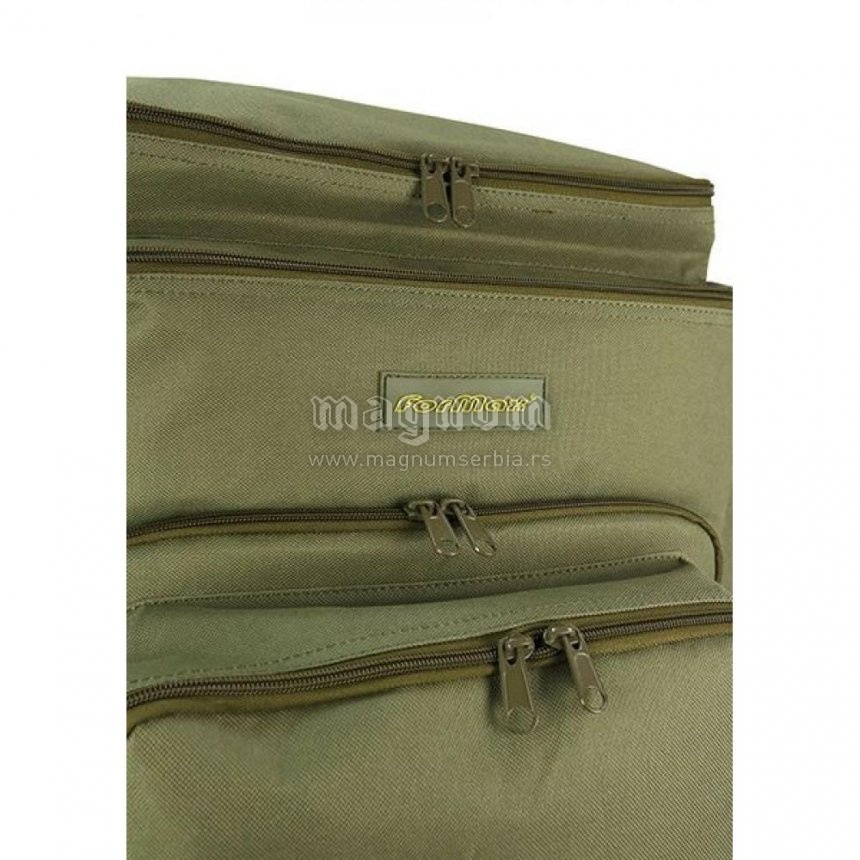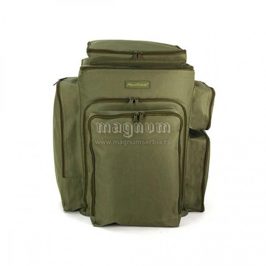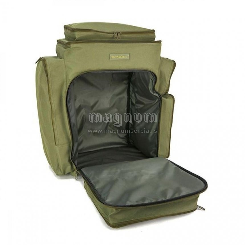 Veliki ranac dimenzija 60x55x34cm, sa puno smeštajnog prostora u sredini i više trodimenzionalnih džepova na bokovima, sa prednje i gornje strane.